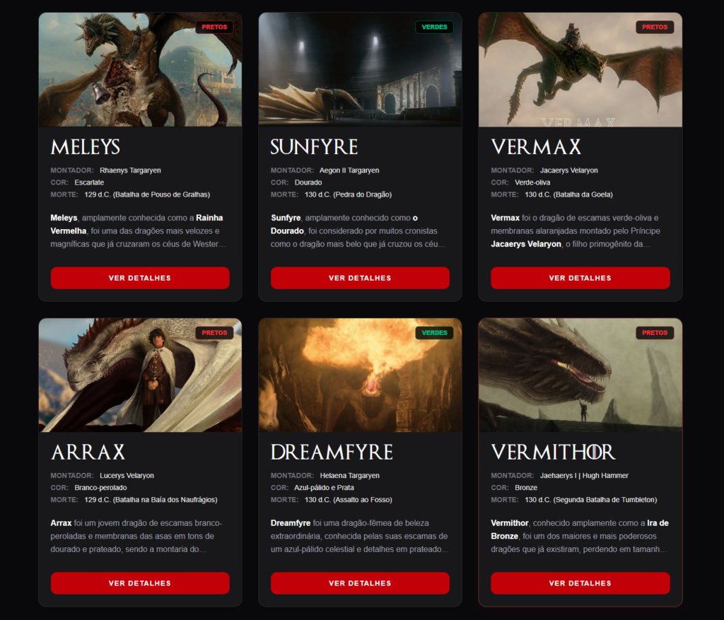 Uma aplicação web interativa e responsiva dedicada a catalogar os majestosos dragões de Westeros, focada no período da Dança dos Dragões. Este projeto foi construído com as tecnologias mais modernas do ecossistema React para entregar uma experiência imersiva e de alta performance.